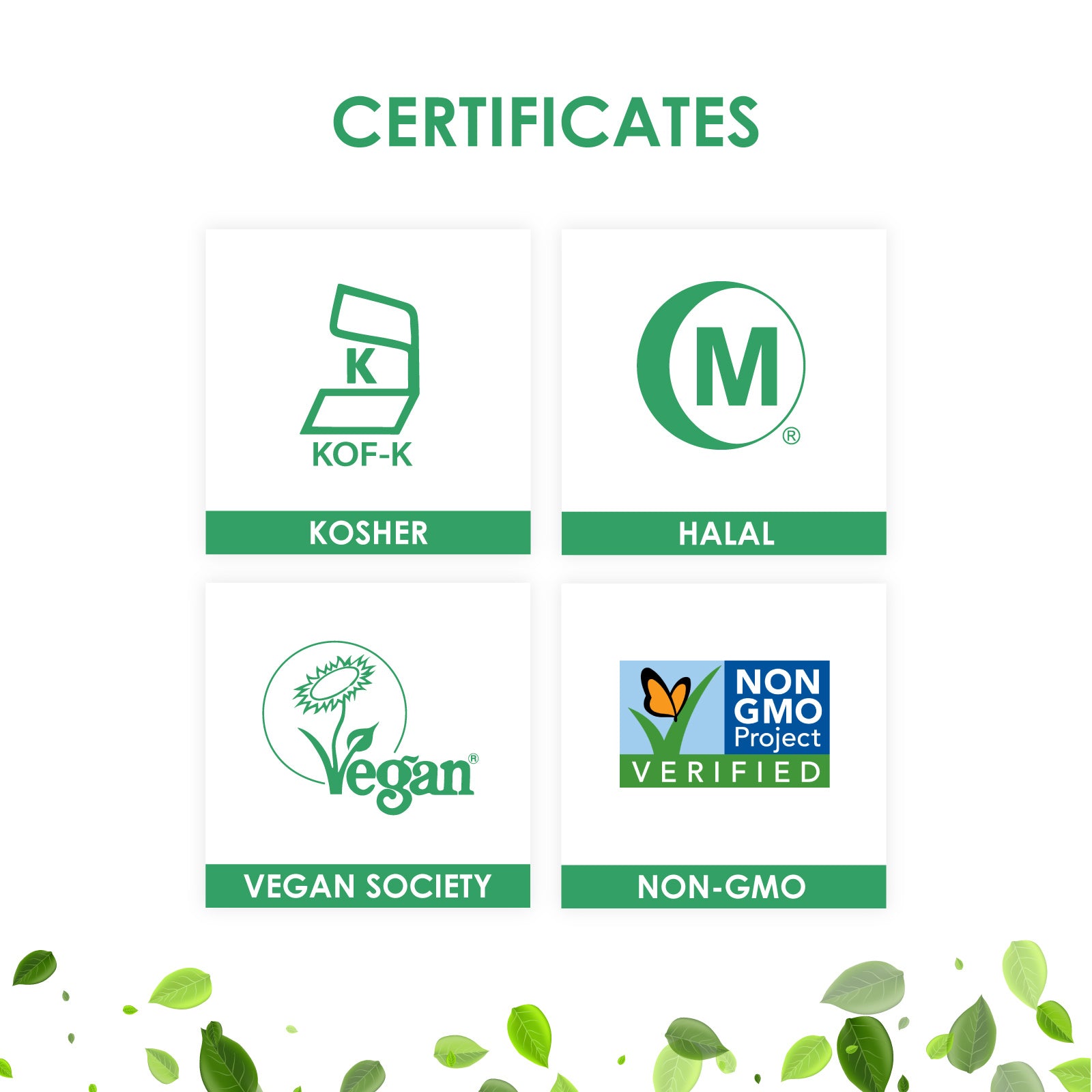 • Pure, high-quality ingredients – Made from the highest-quality HPMC, our veggie capsules meet various dietary needs and preferences. They are non-GMO and free of all animal products, preservatives, starches, and common allergens. Made and packaged at state-of-the-art cGMP-certified and FDA-approved facilities, their third-party “seals of approval” include Vegan Registration with the Vegan Society as well as Kosher and Halal certifications.